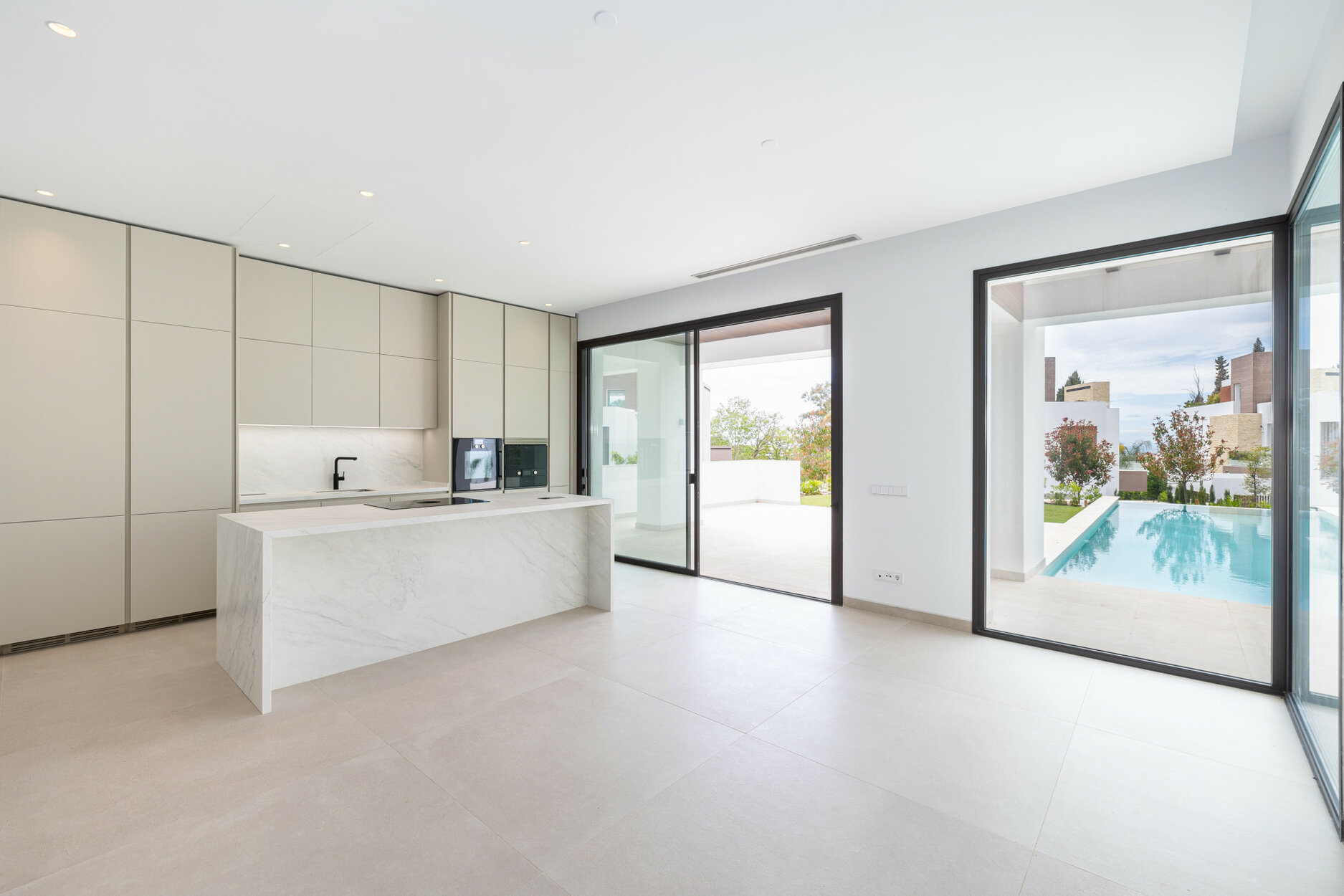 Diese außergewöhnliche Villa in einer exklusiven Wohnanlage von nur 15 Häusern, die vom renommierten Architekten Ernesto Palanco entworfen wurde, vereint Ruhe mit bequemem Zugang zur Promenade, zum Strand und zu lokalen Annehmlichkeiten. Mit 24-Stunden-Sicherheit und Concierge-Services bietet es vollständige Privatsphäre und Ruhe des Geistes. Das Erdgeschoss verfügt über einen offenen Wohnbereich mit einer Gaggenau ausgestatteten Küche, einem Gästeschlafzimmer mit eigenem Bad und einer Gästetoilette, die sich nahtlos mit dem beheizten Pool und dem Außenbereich verbindet. Die zweite Etage bietet eine Master-Suite mit Terrasse und luxuriösem Bad, plus zwei zusätzliche en-suite Schlafzimmer. Im Untergeschoss befinden sich ein Kino, ein Weinkeller, ein Dampf- und Saunaraum, ein Fitnessraum, eine Lounge und Wäscherei. Das Solarium mit Jacuzzi und Außenküche bietet einen atemberaubenden Blick auf das Meer und die Berge. Diese Villa, die vollständig mit einem Smart Home System und reichlich Garagenplatz integriert ist, verkörpert luxuriöses Wohnen in Marbella, wo elegantes Design und außergewöhnliche Annehmlichkeiten zusammenkommen.