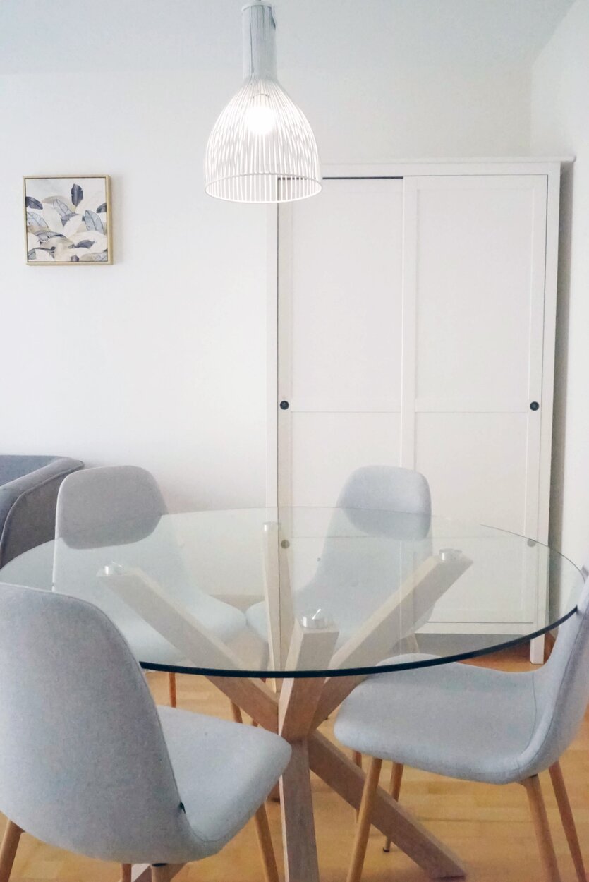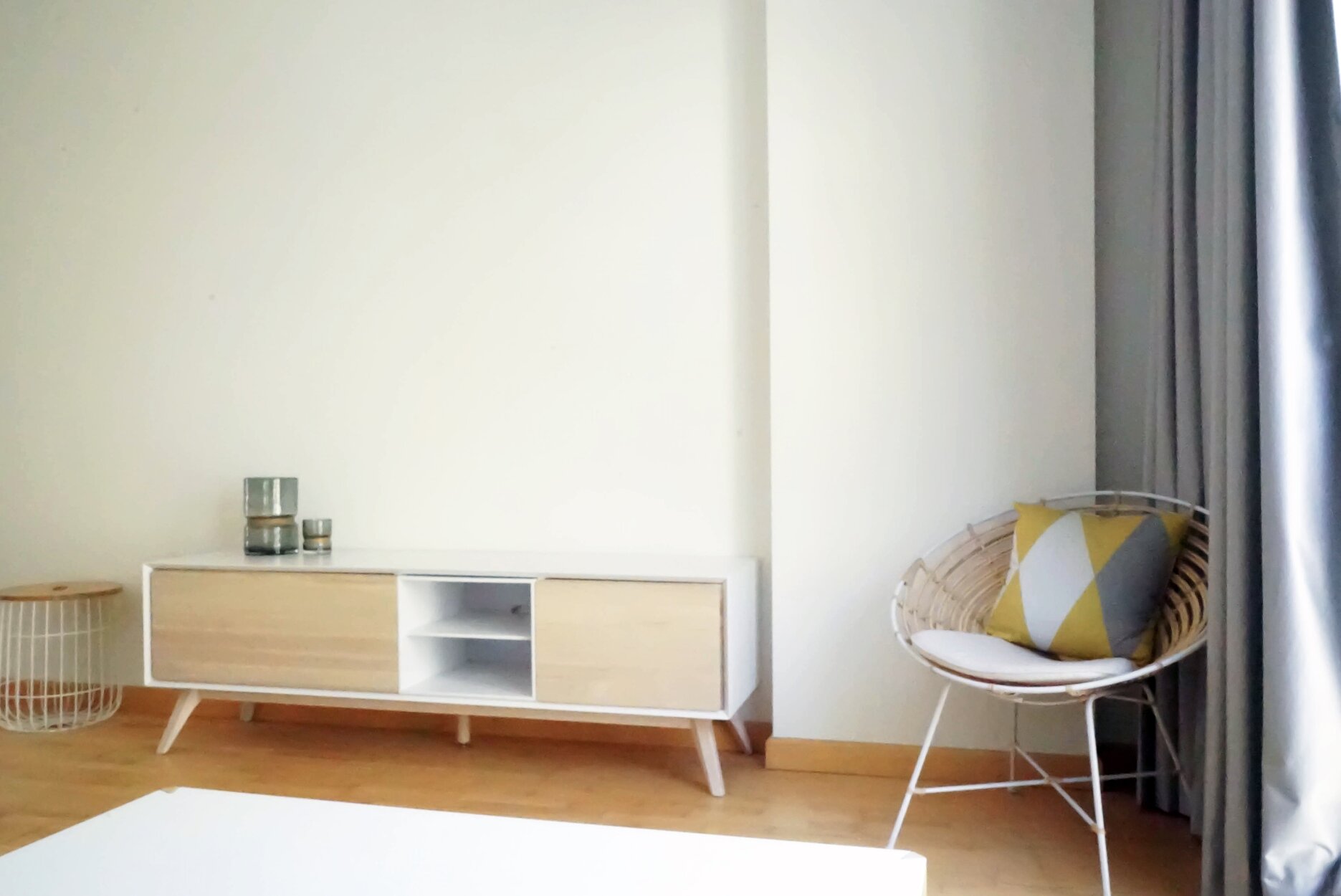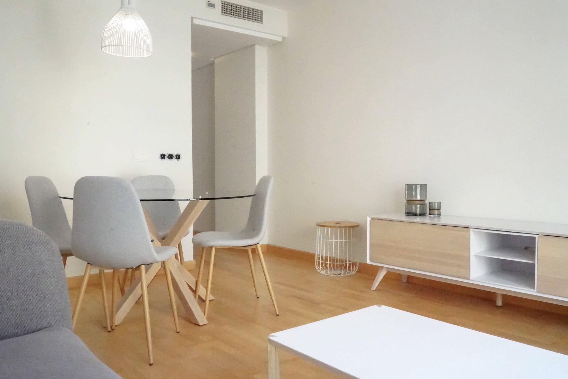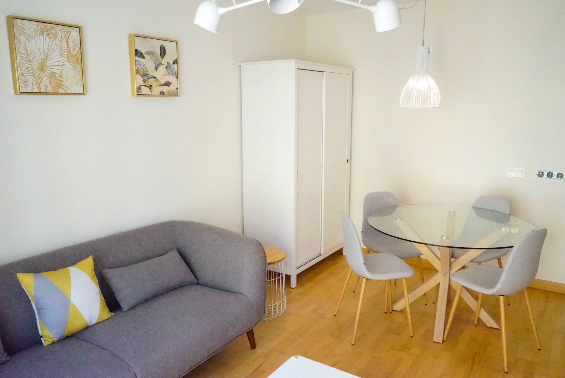 The apartment is delivered in optimal conditions, equipped with air conditioning and with fully equipped kitchen: units, refrigerator, hob, oven, extractor hood integrated into a high cabinet, washer/dryer machine and sink. White finishes.