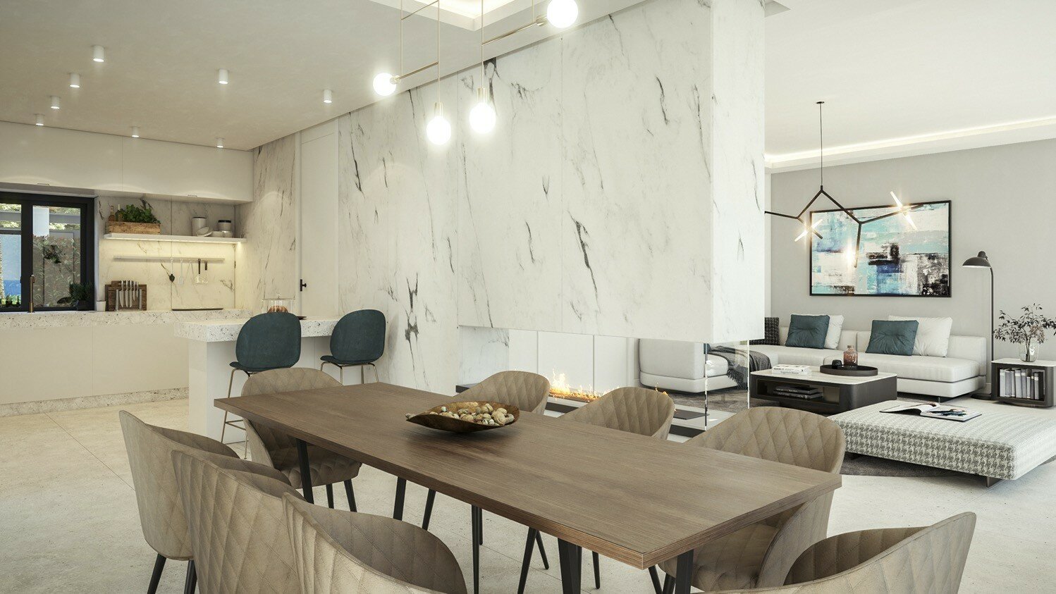 Main floor with a huge open plan kitchen, large living & dining room, guest toilet, some ones with a bedroom with en suite bathroom (4 bedrooms villas),