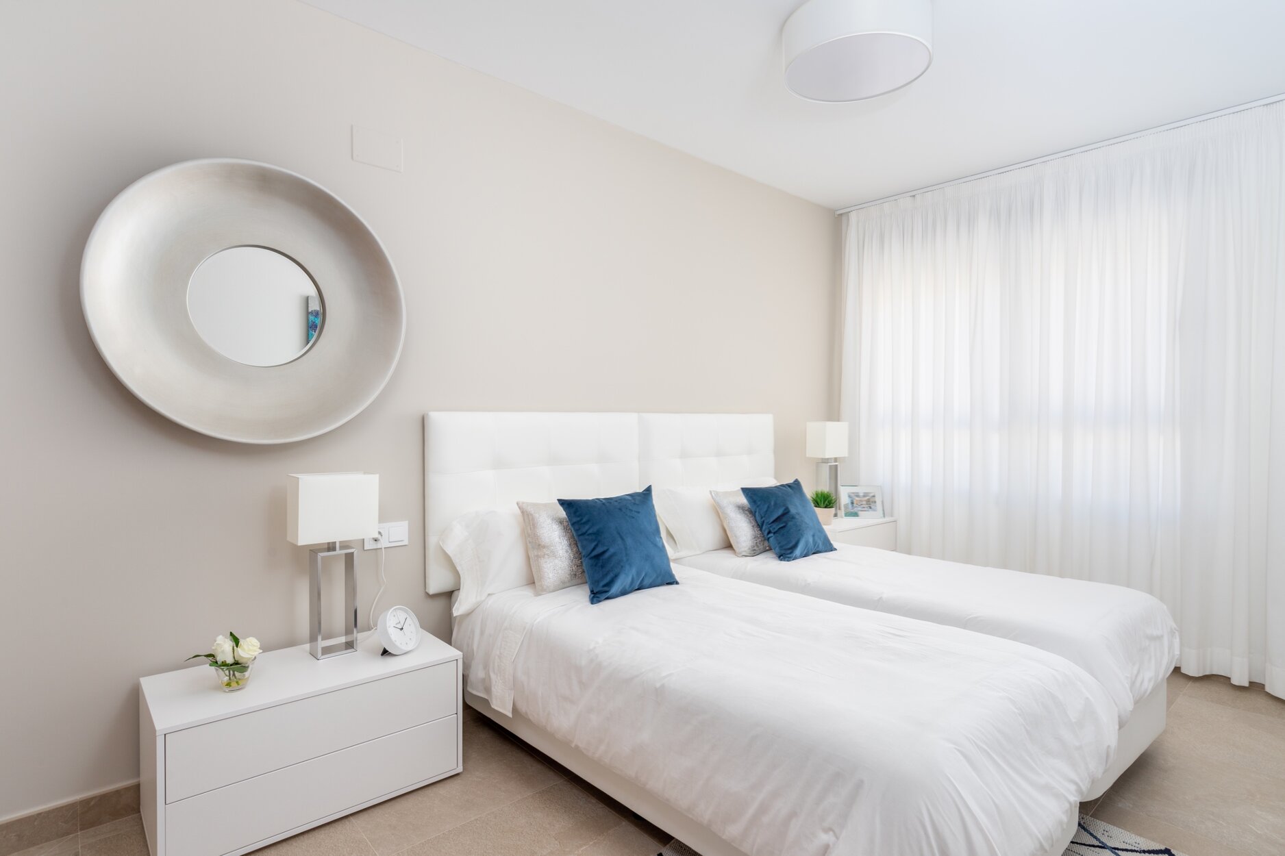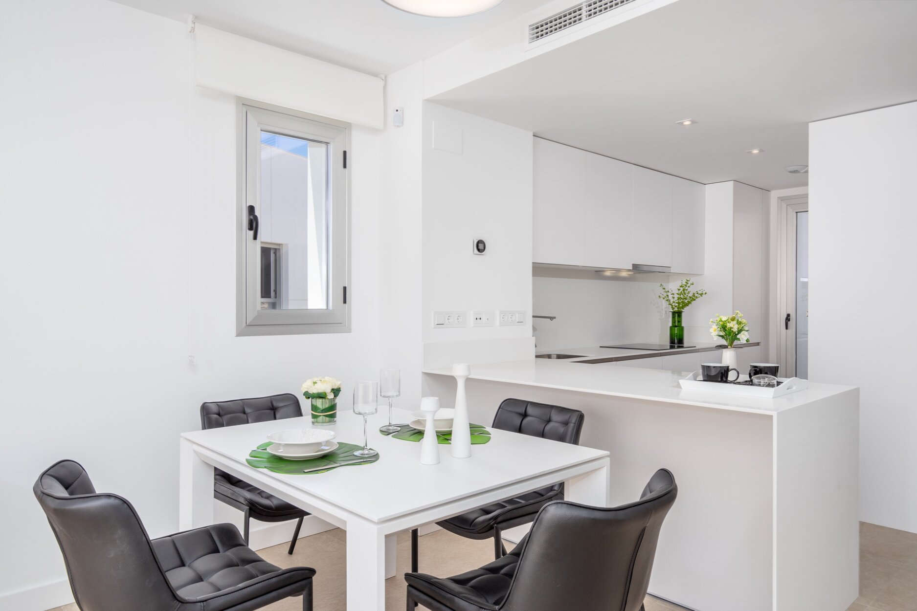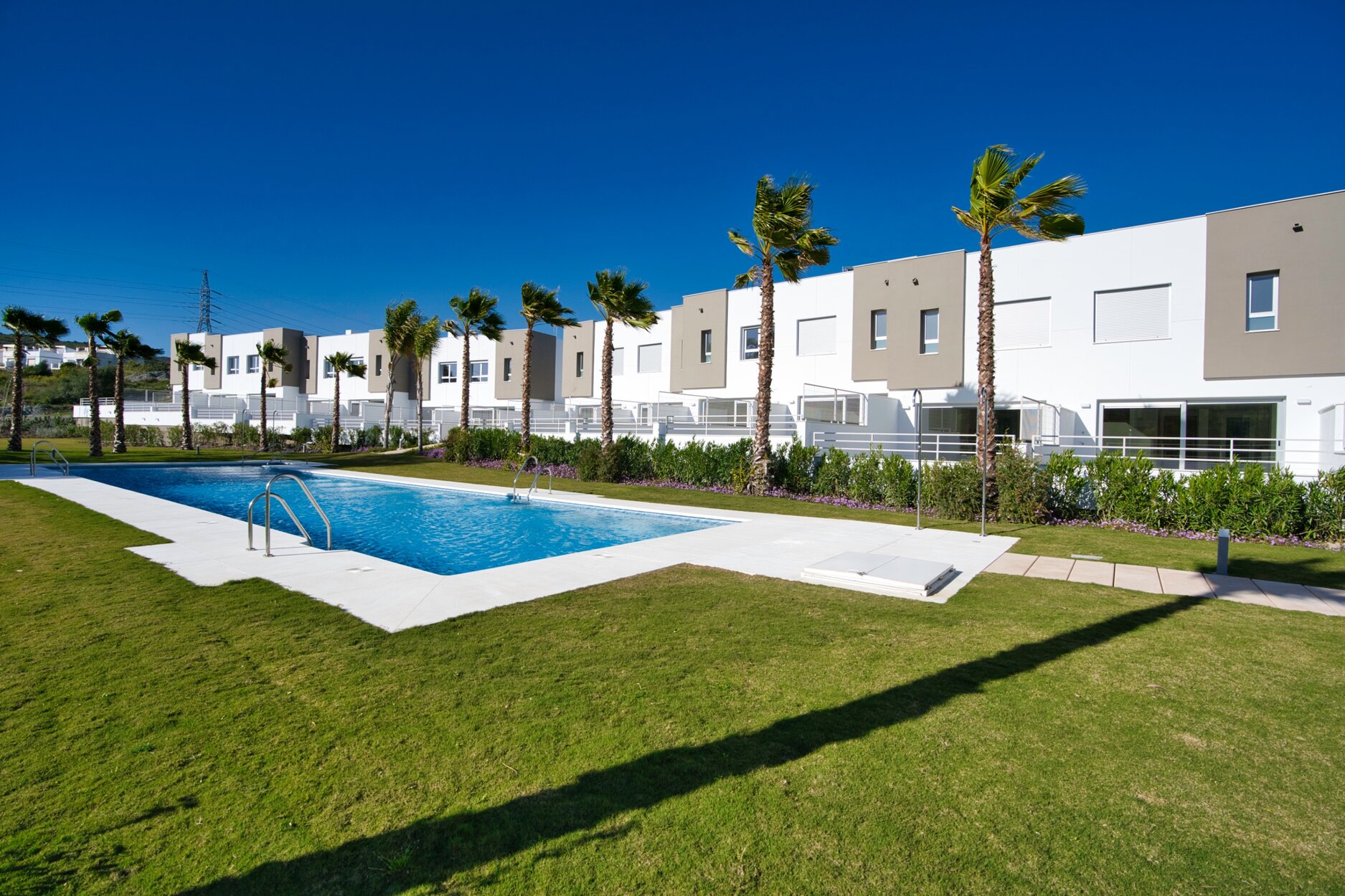 The homes in this complex stand out due to their high quality construction in Mediterranean Style, using top of range materials, large format ceramic flooring tiles, flowing design with the kitchen integrated into the living room, bathrooms with high end fittings, pre-installation hot/cold air conditioning and solar panels.