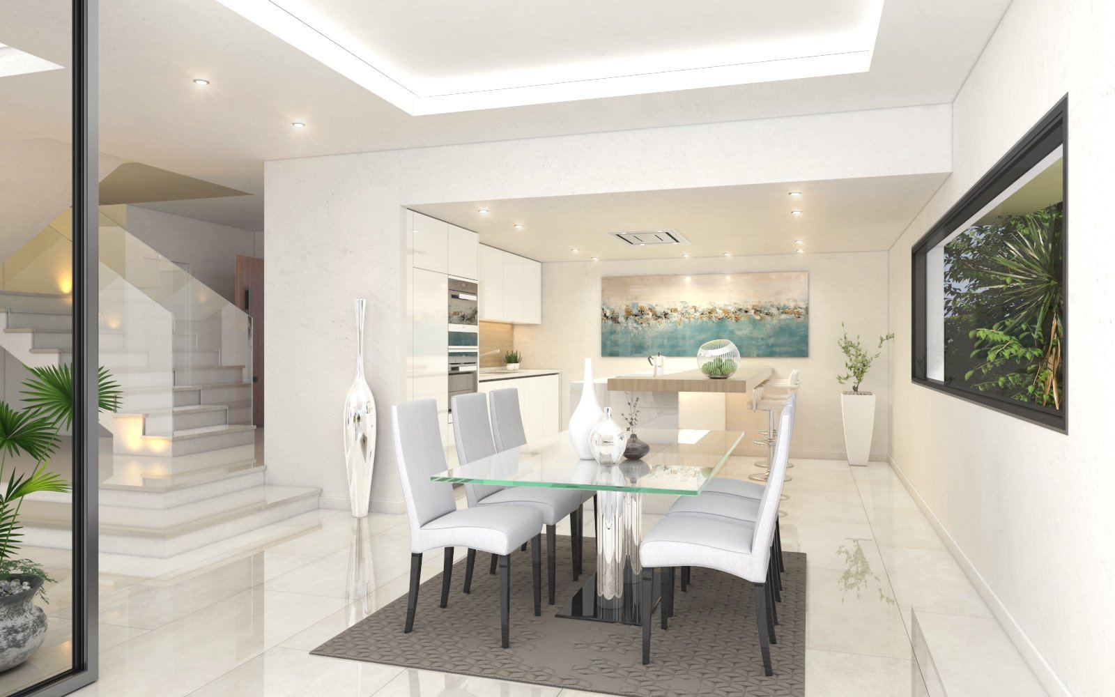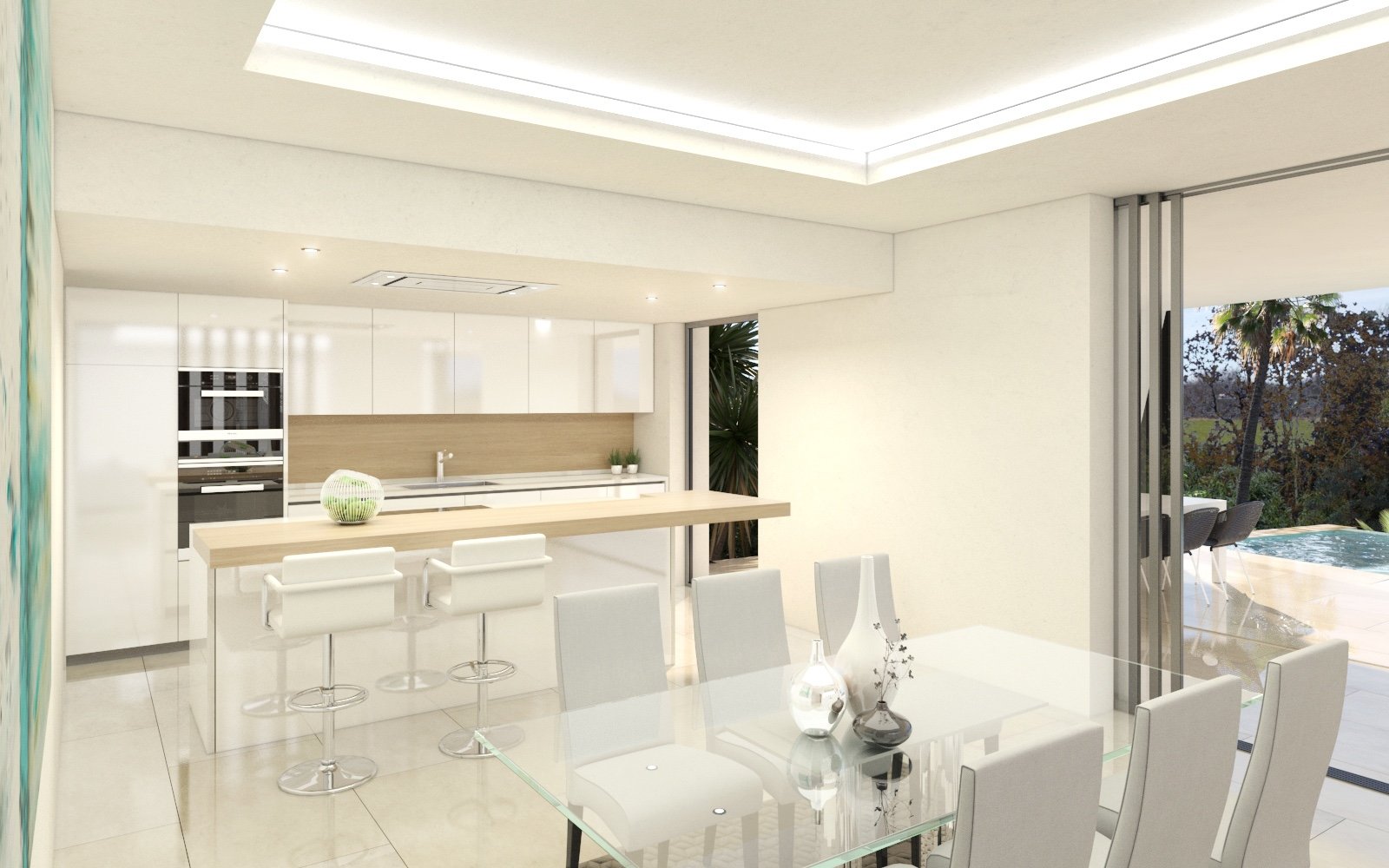 Designed to provide a modern and functional home, with large open plan living areas that connect the best of interior and exterior living spaces by the use of large windows, natural stone and top quality materials throughout. The villas offer large format porcelanic flooring, independent hot and cold air conditioning in all the rooms, modern kitchen open to the living room with Neff brand appliances, large garden and private swimming pool.