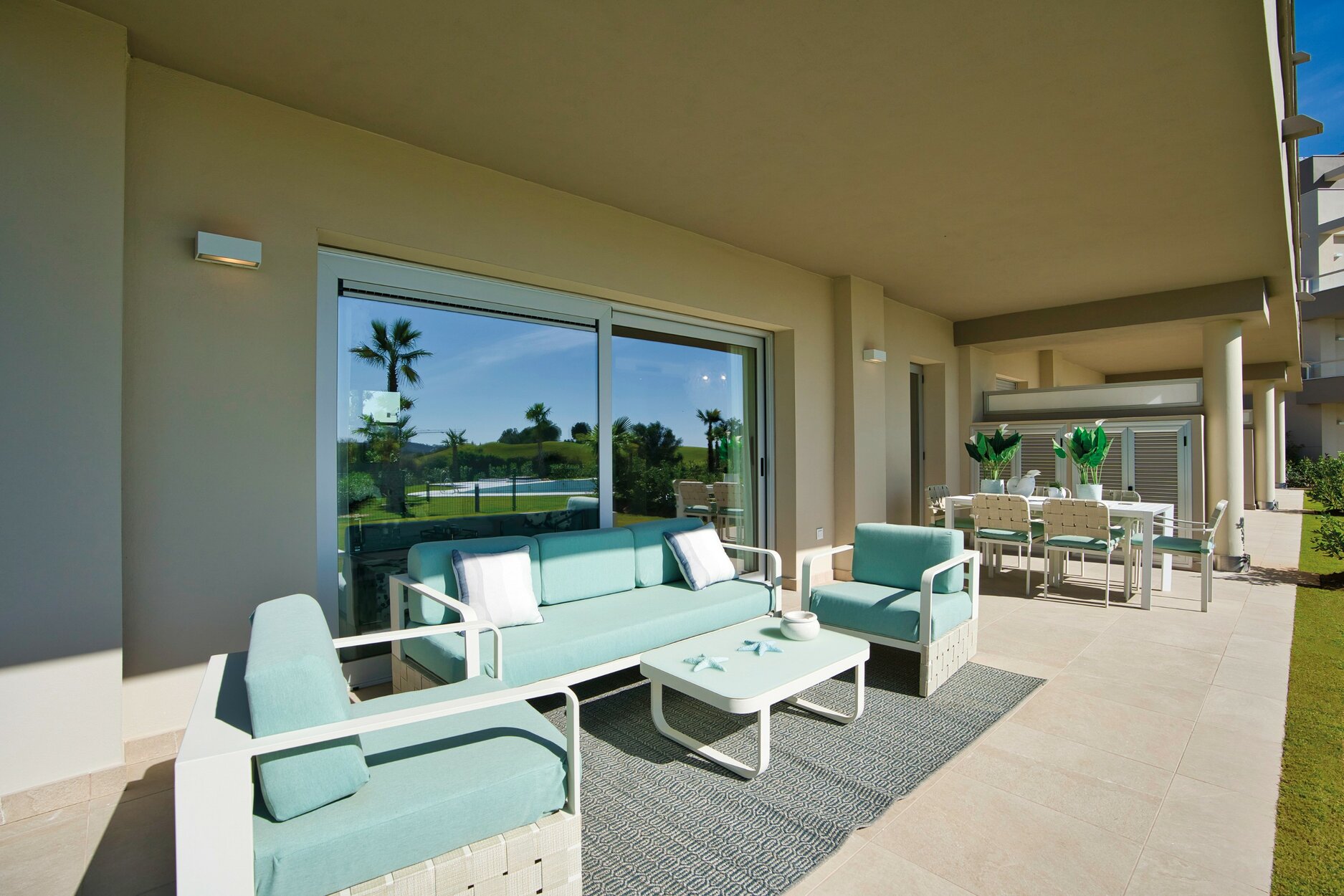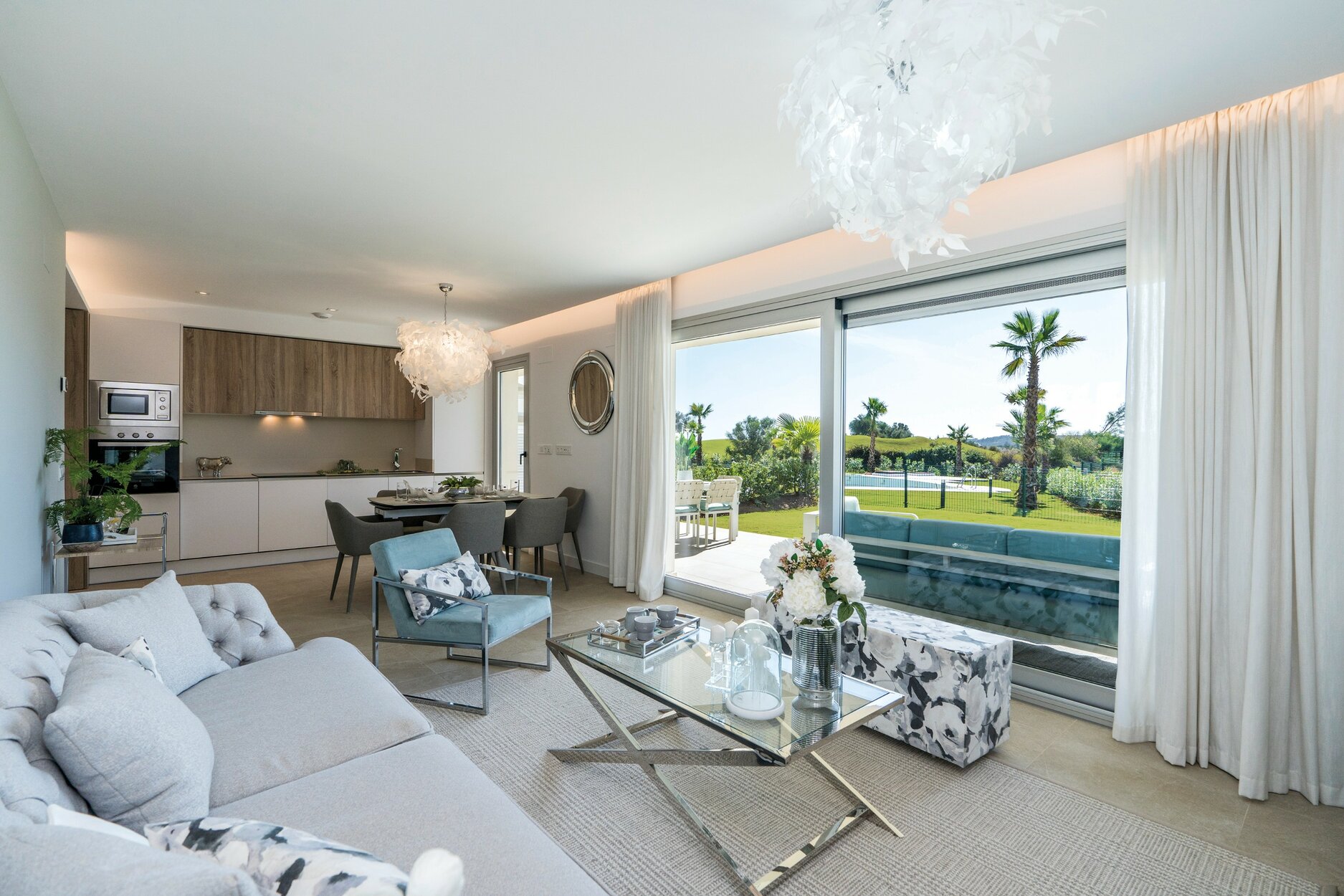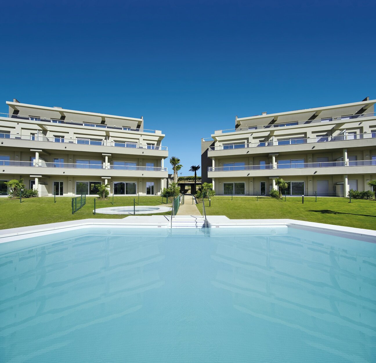 All the apartments have large terraces with glass balcony enclosures so that you can fully enjoy the fabulous views of the golf course and the apartments on the ground floor also have private gardens with views of the pool, resort gardens and the golf course that surrounds the development. The homes have a modern distribution with the “total living” concept where all the space is utilised, and with a large living room integrating the terrace via the large windows.