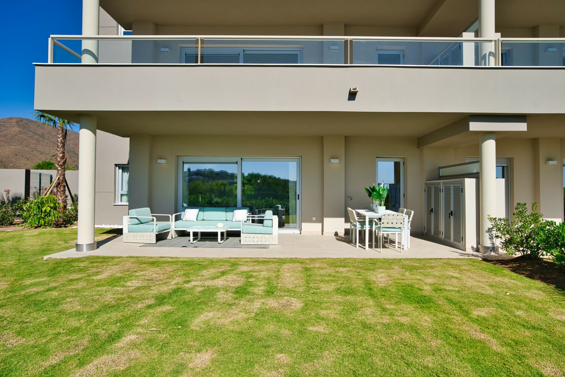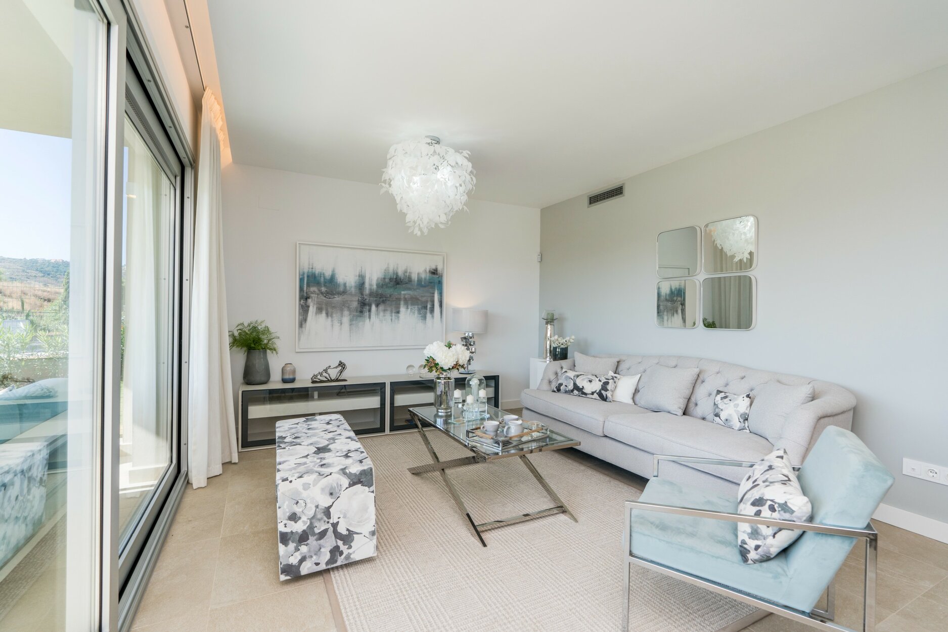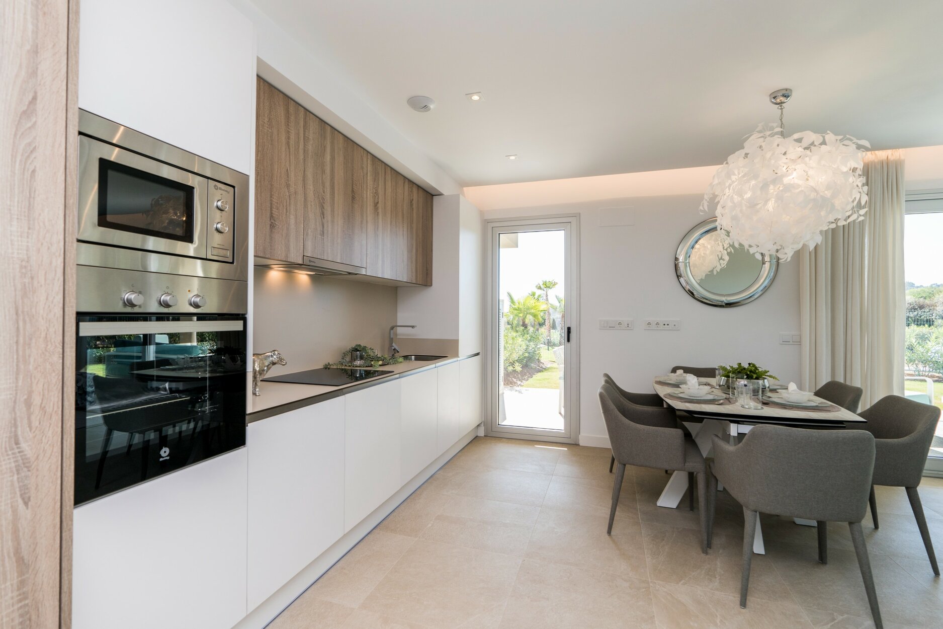 All the apartments have large terraces with glass balcony enclosures so that you can fully enjoy the fabulous views of the golf course and the apartments on the ground floor also have private gardens with views of the pool, resort gardens and the golf course that surrounds the development. The homes have a modern distribution with the “total living” concept where all the space is utilised, and with a large living room integrating the terrace via the large windows.