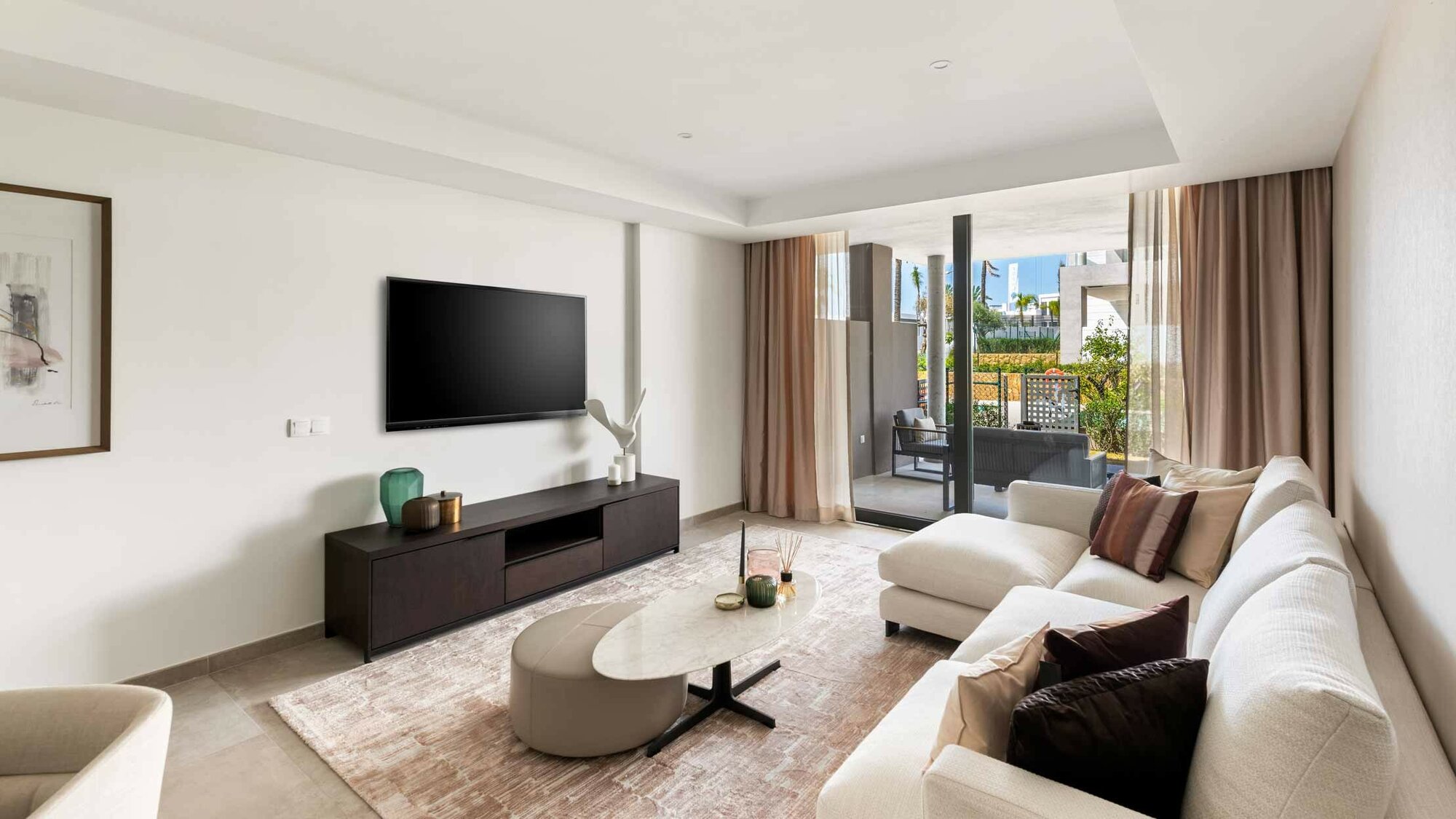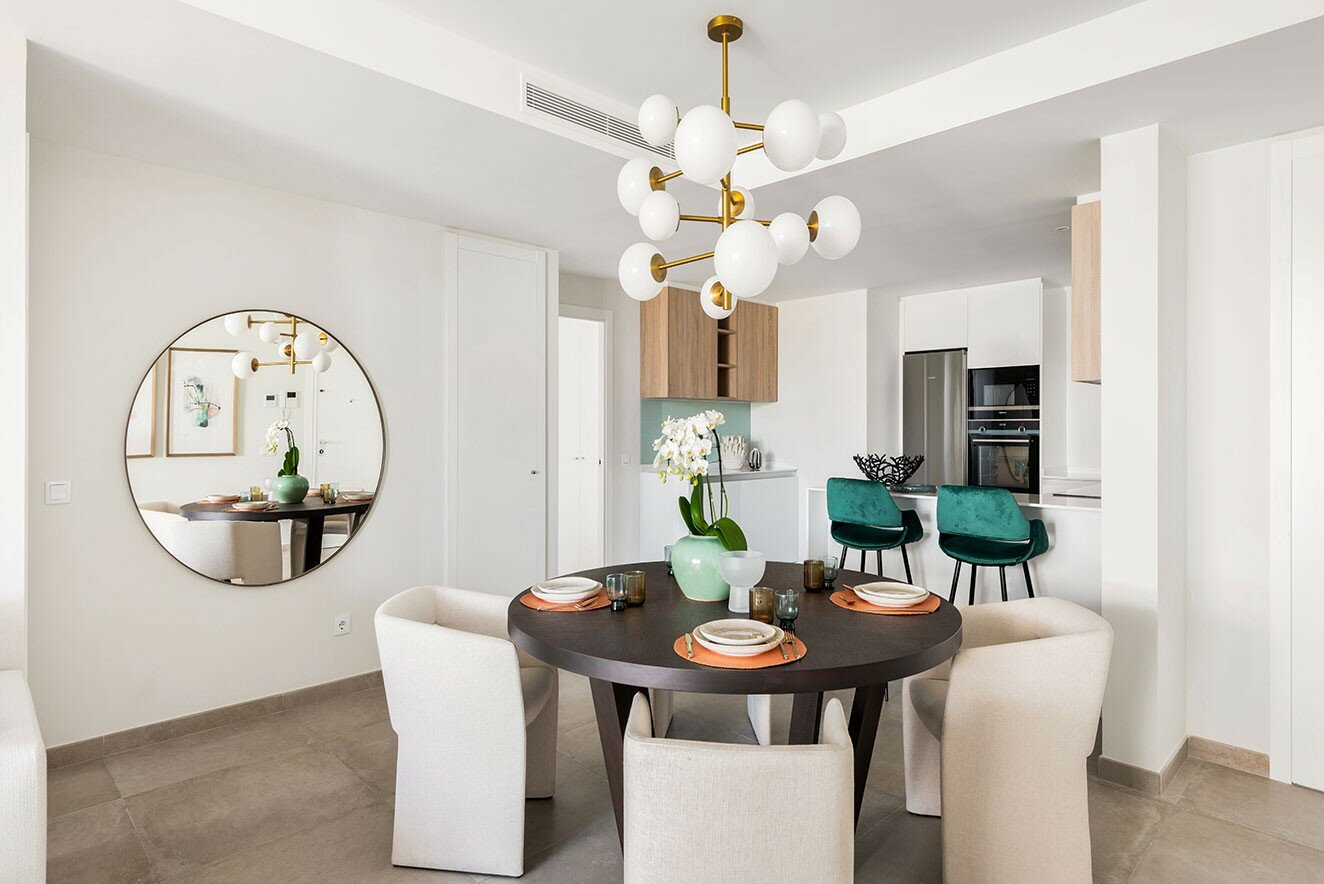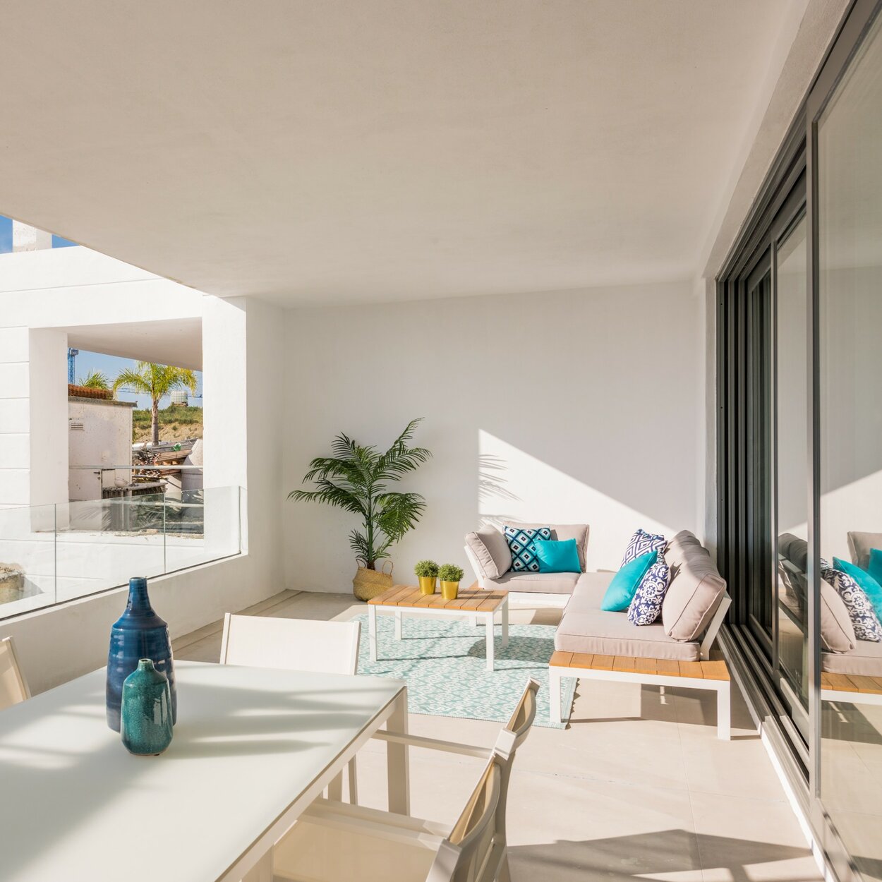 The area is made up of a spacious living room and a modern kitchen, complete with dining room. The sliding windows occupy the entire wall allowing natural light to enter in addition to being able to enjoy magnificent views and can be opened to access the large terrace with an external living and dining room.This apartment is perfect to take full advantage of the pleasant climate of Marbella throughout the year, you will be just a few steps from the private pool, surrounded by beautiful lawns and ecological gardens.