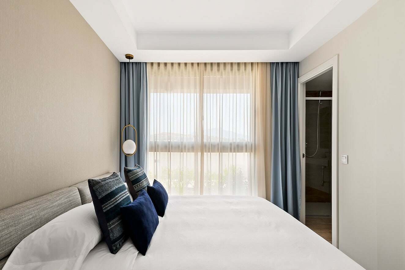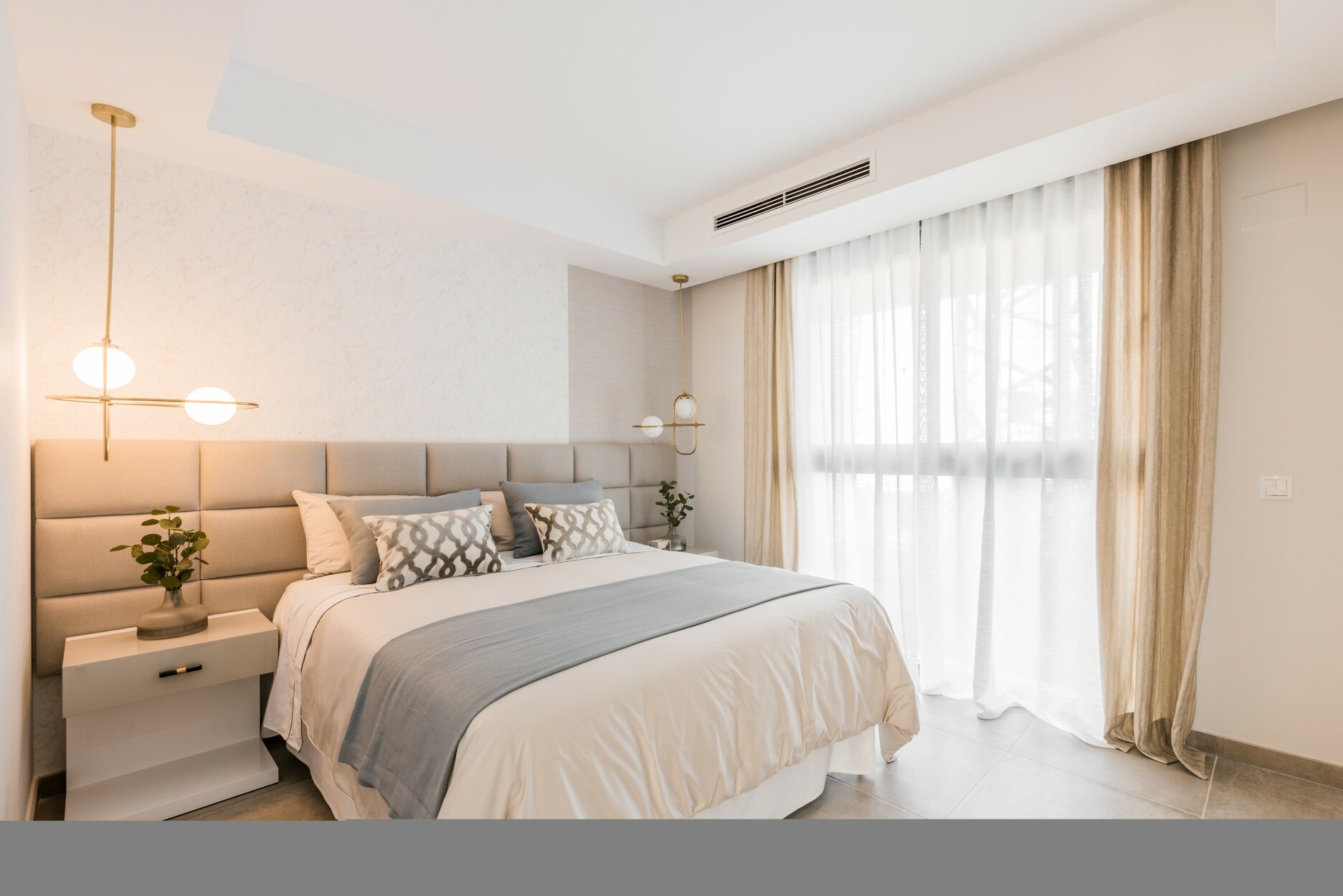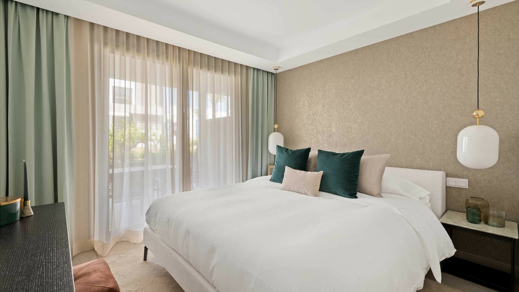The area is made up of a spacious living room and a modern kitchen, complete with dining room. The sliding windows occupy the entire wall allowing natural light to enter in addition to being able to enjoy magnificent views and can be opened to access the large terrace with an external living and dining room.This apartment is perfect to take full advantage of the pleasant climate of Marbella throughout the year, you will be just a few steps from the private pool, surrounded by beautiful lawns and ecological gardens.