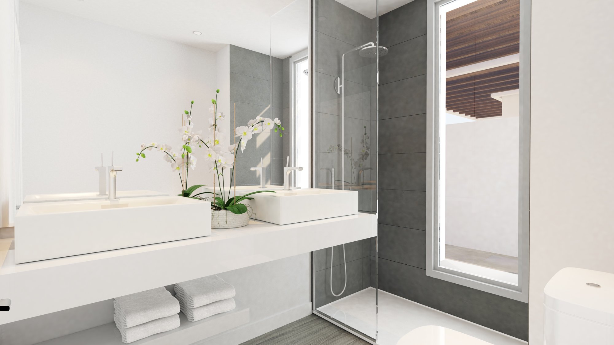 The configuration will depend on what type of apartment you choose but ample bedrooms boast fitted wardrobes and an en-suite double bathroom with the master bedroom also benefiting from a walk-in dressing room. A fully equipped kitchen featuring high gloss white units adds to the modern feel preferred by our international clients. Penthouses benefit from a stylish rooftop solarium where you can relax and unwind in your own private sanctuary.